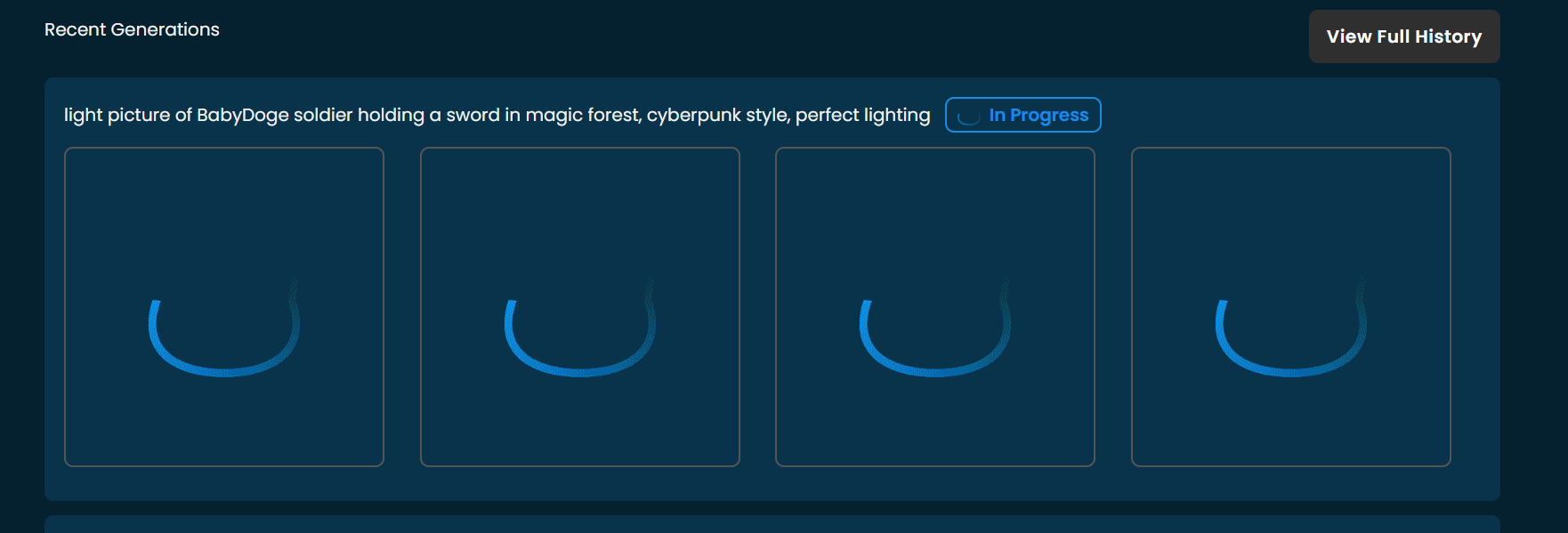 <figure><img src="https://content.gitbook.com/content/LnI4tNuTJZbbQk56yaJh/blobs/sLvT7Gv4f1eguyx5j1QB/generating-image.png" alt=""><figcaption><p>Image generation in progress</p></figcaption></figure>
