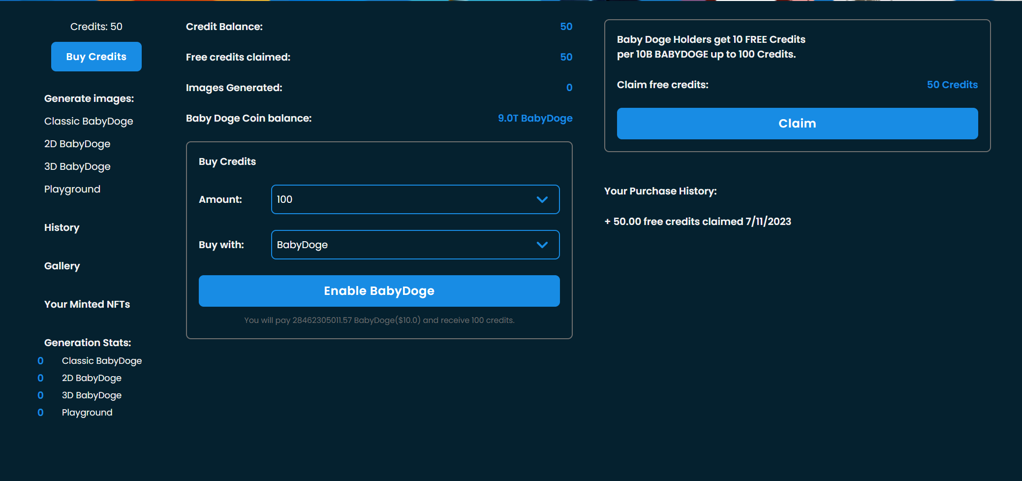 BabyDoge token holders automatically have free credits to claim! Token holders get 1 free credit for each billion of BabyDoge they hold, up to a maximum of 50 credits.