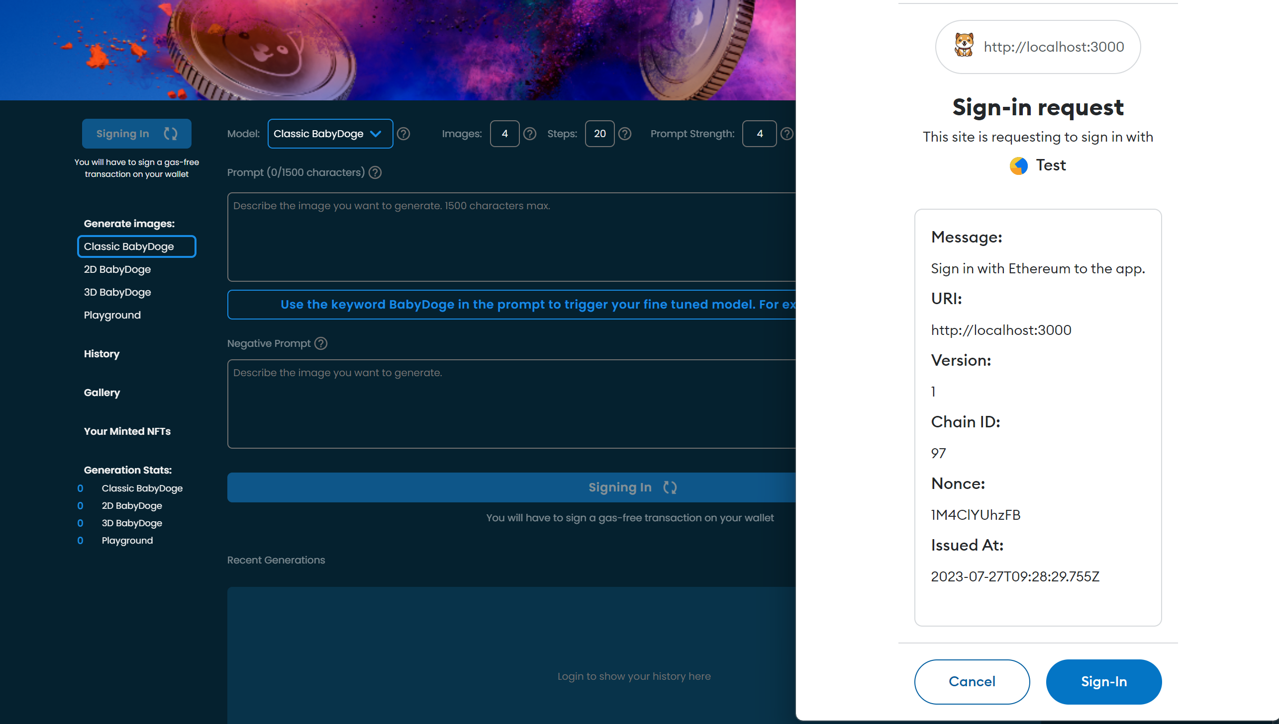 There's one more step: signing a gasless (free) transaction. It's like signing into a website, but for crypto. Don't worry, there's no cost to you for this. Once you're signed in, we can go and get credits!