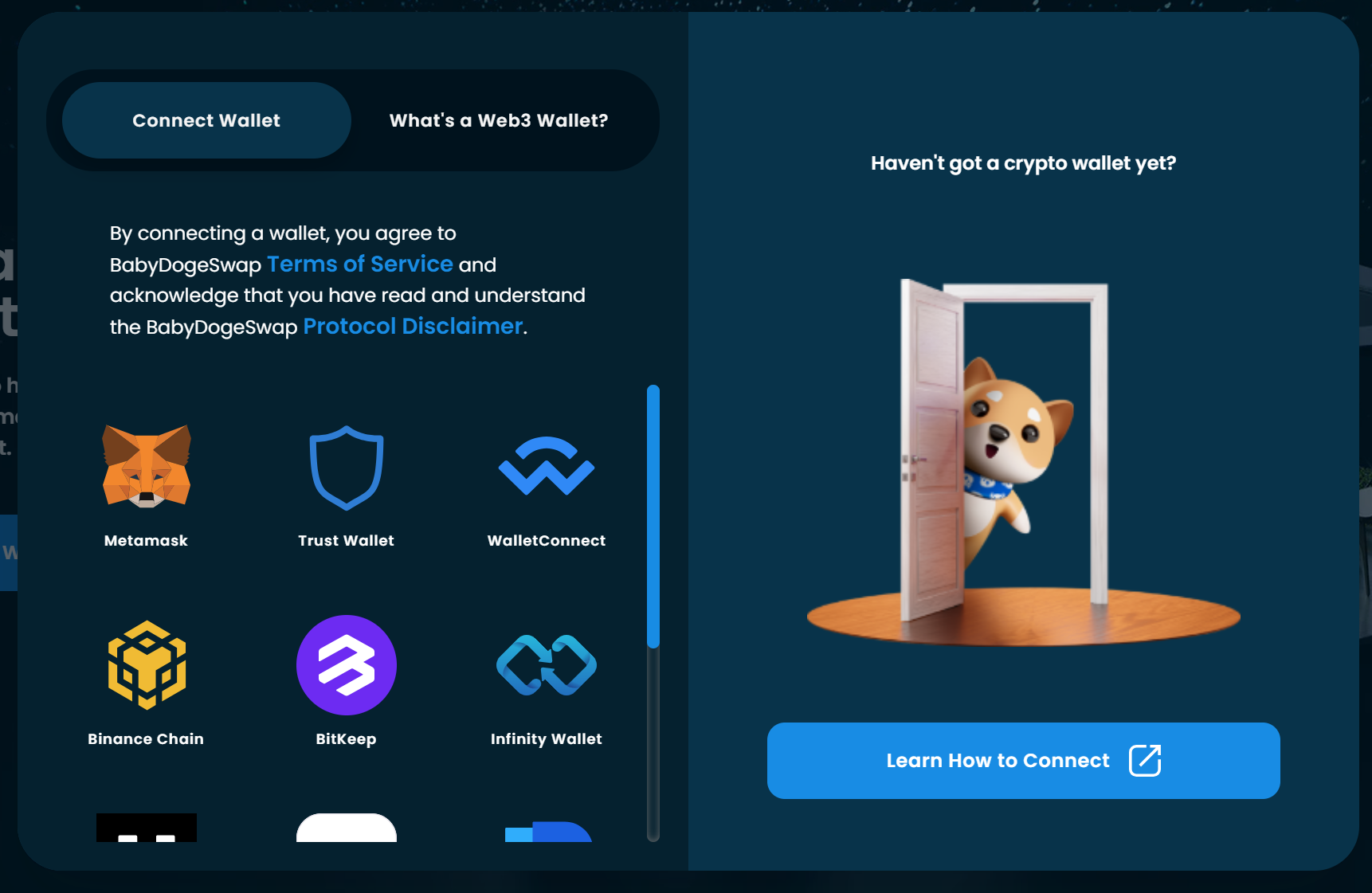[Connect your wallet](https://docs.babydogeswap.com/babydoge-docs/get-started/connect-your-wallet-to-babydogeswap)