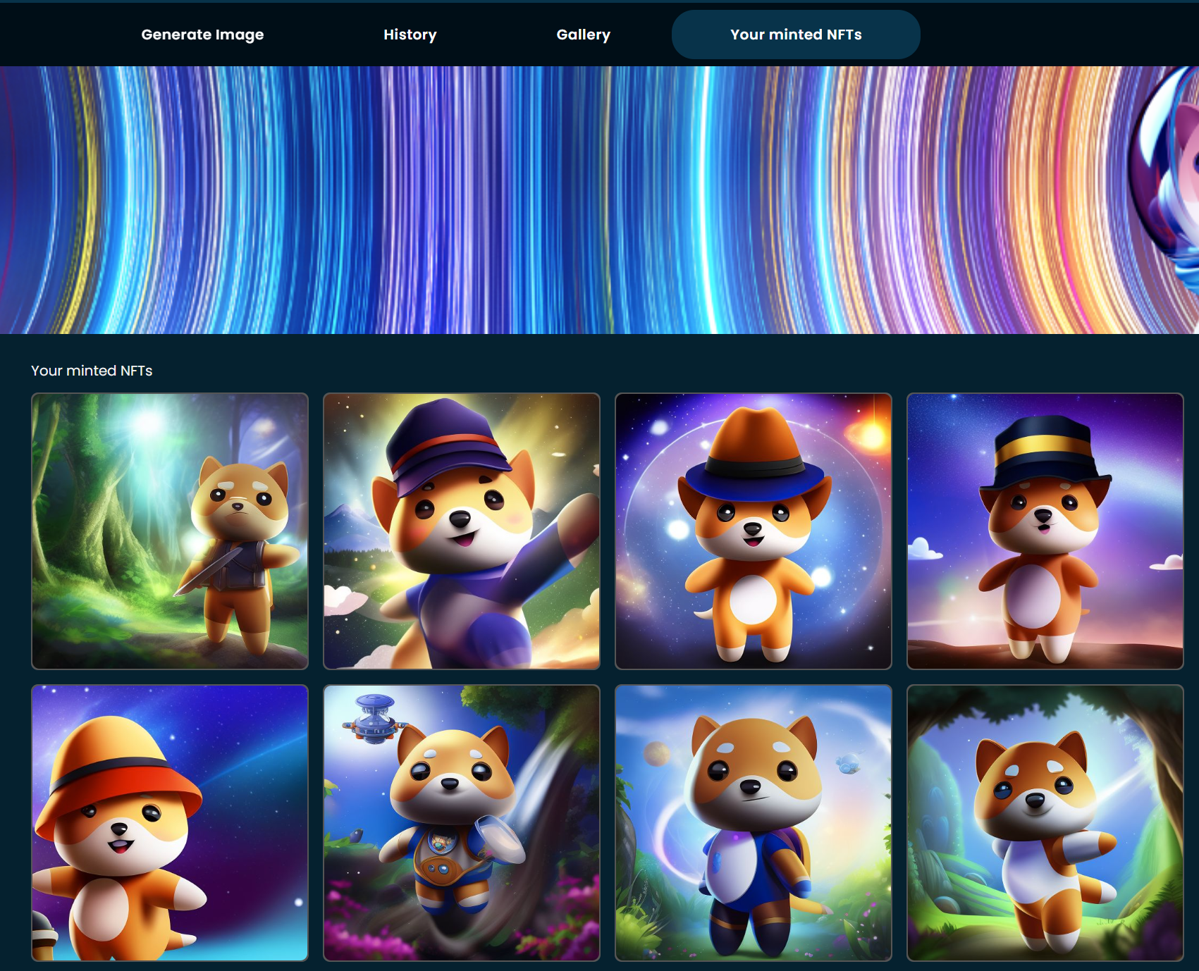 This page displays all your minted NFTs in one place. If you click on an image, it'll take you to the History page where you can view information about that image/NFT.