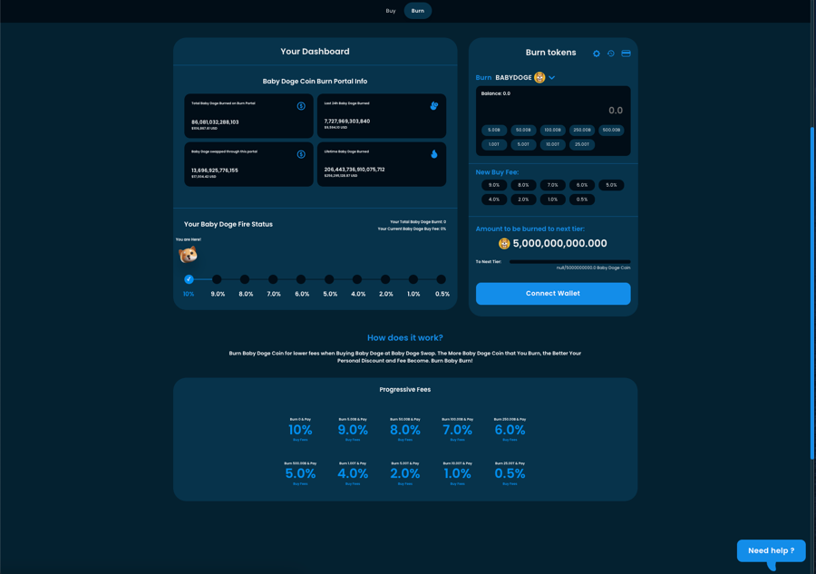 The Multi Token Burn Portal allows users to interact with burn portal flows for both BabyDoge Coin and active tokens set by the contract admin. Are you a project interested in adding your token to the burn portal? Contact us for a partnership inquiry!