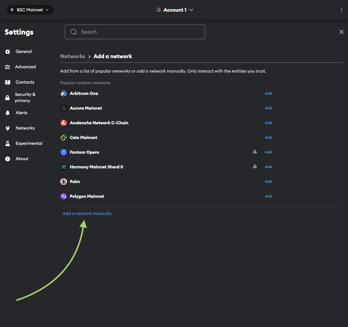 To add a new custom network (for example, the Binance Smart Chain or Polygon), scroll down to the bottom of the "Networks" tab and click on the "Add Network" button. Then you will see the list of available chains, from here you can choose desired chain or click "Add a network manually" button. We will add it manually.
