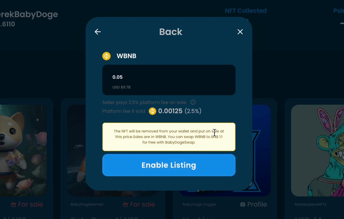 Click "Enable Listing" and accept the approval in your wallet