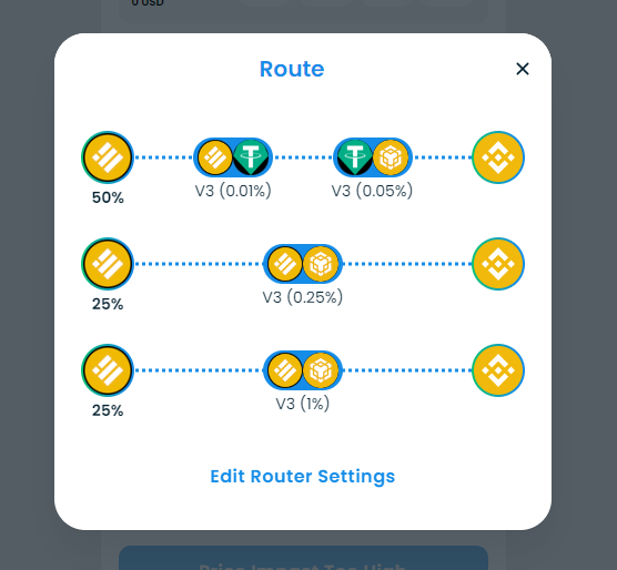**Split routing** helps achieve more consistent token prices, lowering price impact on applicable swaps.  This is possible by splitting a single swap across multiple routes. This works in tandem with multi-hops.